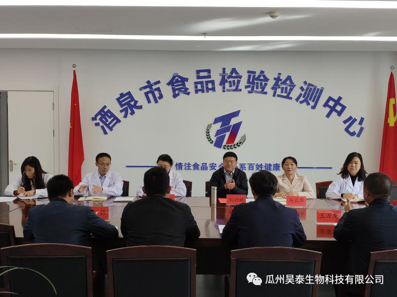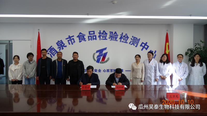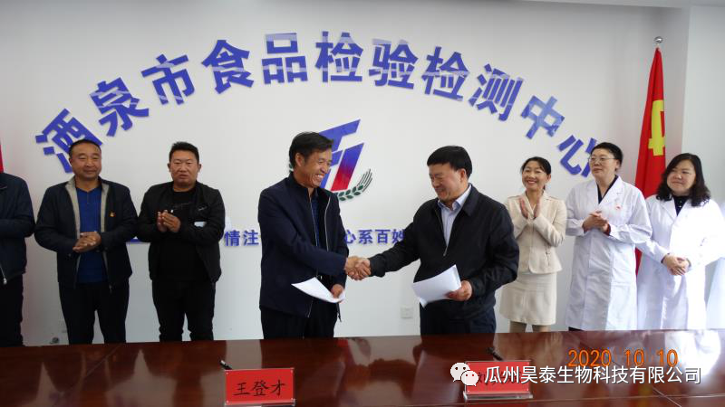 10月10日下午,瓜州昊泰生物科技有限公司與酒泉市食品檢驗檢測中心進行了食品科研合作協議簽約儀式。活動在酒泉市食檢中心六樓會議室舉行,由市食檢中心副主任馬正華主持,昊泰科技董事長王登才等相關部門負責人、市食檢中心主任劉興斌等中心全體領導干部職工參加了本次活動。